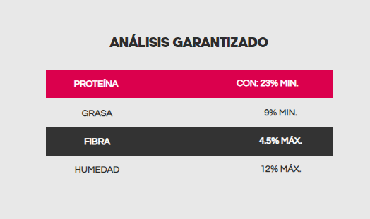 Maíz, Harina de carne y hueso de res, Salvadillo, Pulidura de arroz, Gluten de maíz, Harina de pollo (vísceras y carne), Grasa de cerdo y/o pollo y/o res, Sabor natural de pollo y/o cerdo, Extracto de Yucca Schidigera, Secuestrante de micotoxinas (aluminosilicatos, tierras diatomeas, extracto de algas), Cloruro de Colina, Cloruro de Potasio, Suplemento de vitamina E y vitamina C como antioxidantes, Suplemento de vitamina A, Ácido Fólico, Ácido Pantoténico, Biotina, Nicotamida, Mononitrato de Tiamina, (vitamina B1), Suplemento de Riboflavina (vitamina B2), Suplemento de Piridoxina (vitamina B6), Suplemento de Cianocobalamina (vitamina B12), Suplemento de vitamina D3 y vitamina K3, Zinc Orgánico, Calcio, Sulfato de Cobre, Sulfato de Manganeso, Selenito de Sodio, Sulfato de Zinc, Sulfato Ferroso, Yoduro de Potasio, Sal, Colorantes: rojo # 40, rojo #6, amarillo #5, azul #2, amarillo #6, Fungicida (propionato de calcio), Antioxidantes (BHA/BHT).