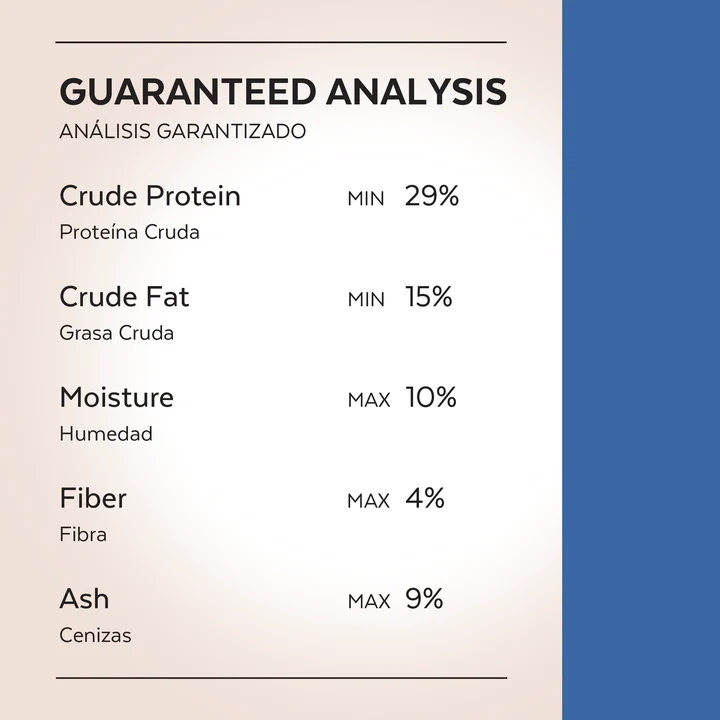 Harina de pavo, harina de arroz, pavo, harina de salmón, grasa de cerdo (conservada con tocoferoles), tilapia, harina de pescado, hidrolizado de cerdo, pulpa de remolacha, plasma porcino, alga marina Phaeophyta, leche de vaca en polvo, cultivo de levaduras Saccharomyces Cerevisiae, sal, aluminosilicato de sodio, ácido cítrico, inulina de agave, extracto de Yucca schidigera, L-lisina, DL-metionina, producto seco de fermentación bacillus amyloliquefaciens, carbonato de cobalto, carbonato ferroso, fosfato cálcico, sulfato de cobre, selenito de sodio, óxido de magnesio, óxido de zinc, óxido de manganeso, alfa tocoferol acetato (vitamina E), niacina, vitamina A palmitato, suplemento de vitamina D3, suplemento de tiamina mononitrato, riboflavina, clorhidrato de piridoxina, suplemento de vitamina B12, suplemento de pantotenato de calcio, ácido fólico, complejo manganeso glicina, complejo cobre-glicina, complejo hierro-glicina, complejo zinc-glicina, rojo 40.