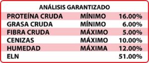 Cereales y sus subproductos, harinas de origen animal (pollo, res y/o puerco), pastas de oleaginosas, grasas de origen animal (pollo, res y/o puerco) (estabilzadas con BHA/BHT), aceite vegetal (estabilizado con BHA/BHT), saborizantes, colorantes y extracto de yuca. Vitaminas: Vitamina A (Acetato), Vitamina D3 (Colecalciferol), Vitamina E (Acetato), Vitamina K3, Vitamina K3, Vitamina B1 (Tiamina), Vitamina B2 (Riboflavina), Vitamina B5 (Ácido Pantoténico), Vitamina B6 (Piridoxina), Vitamina B9 (Ácido Fólico), Vitamina B12 (Cianocobalamina), Nicotinamida, Biotina, Betacaroteno, Cloruro de Colina. Minerales: Carbonato de calcio, Cloruro de sodio, Sulfato de cobre, Sulfato de hierro, Sulfato de Manganeso, Yoduro de Potasio, Sulfato de Zinc, Selenito de sodio.