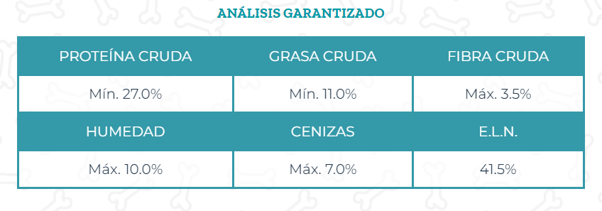 Cereales (trigo, maíz), harina de carne de ave, harina de carne de cerdo, pasta de oleaginosas, pulpa de remolacha, grasa de ave y cerdo (preservadas con BHA/BHT), lisina, metionina. Minerales: fósforo, calcio, sodio, zinc, hierro, manganeso, cobre, EDDI, selenio, cobalto, potasio. Vitaminas: A, D, E, K y complejo B (tiamina, riboflavina, ac. pantoténico, piridoxina, ácido fólico, cianocobalamina, niacina, biotina).