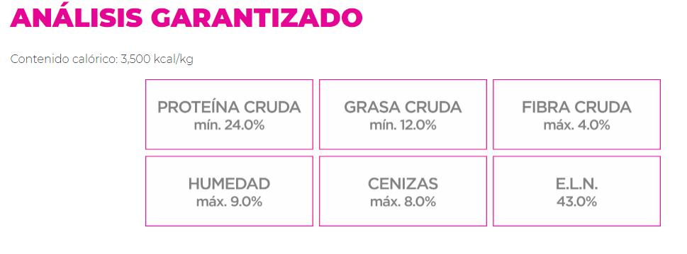 Harina de carne de res, arroz, maíz, carne de pollo, concentrado de proteína vegetal, grasa de pollo, harina de carne de pollo, pulpa de remolacha, semilla de linaza, harina de pescado, sabor natural de pollo, fósforo, calcio, sodio, extracto de raíz de achicoria, cloruro de colina, levadura hidrolizada (Saccharomyces cerevisiae activa 10×1010), acetato de retinol (fuente de vitamina A), colecalciferol (fuente de vitamina D), acetato de DL- alpha tocoferol (fuente de vitamina E), menadiona nicotinamida bisulfato (fuente de vitamina K), ácido ascórbico (fuente de vitamina C), mononitrato de tiamina (fuente de vitamina B1), riboflavina (fuente de vitamina B2), ácido nicotínico (fuente de vitamina B3), clorhidrato de piridoxina (fuente de vitamina B6), cianocobalamina (fuente de vitamina B12), D-biotina (fuente de vitamina H), D-pantotenato de calcio (fuente de vitamina B5), ácido fólico, hierro orgánico, manganeso orgánico, selenio orgánico, cobre orgánico, zinc orgánico, EDDI, extracto de Yucca schidigera, mezcla de romero y tocoferoles como conservadores.