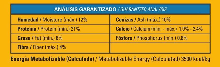 Cereales y sus Derivados, Harina y Subproductos (Menudencias) de Pollo, Res, Puerco y Pescado, Levadura de Cervecería Deshidratada, Pastas de Oleaginosas, Sabor Natural de Pollo, Puerco, Res y Artificial, Grasa de Res, Puerco y Pollo, Aceite Vegetal (Fuente Natural de Ácido Linoleico), Pulpa de Remolacha, Derivados de Yucca, Colorantes de Origen Natural y Artificiales, Aluminosilicatos, Zeolitas, Sal Yodatada, Metionina, Antioxidantes (BHA/BHT), Vegetales deshidratados, Triptófano. VITAMINAS: Suplementos de Colina, Vitamina A, Vitamina D, Vitamina E, Ácido Pantoténico, Riboflavina, Tiamina, Cobalamina , Biotina. MINERALES: Óxidos y/o Sales de Calcio, Potasio, Zinc, Cobre, Yodo y Selenio.