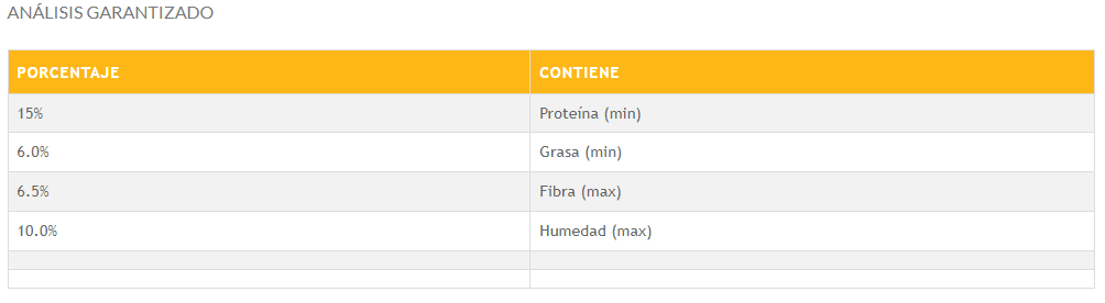 Cereales, subproductos de cereales, pastas de oleaginosas, harina de carne y hueso de bovino y/o equino, grasa de origen animal bovino, sal, extracto de Yuca, premezcla vitamínica y premezcla minerales.
